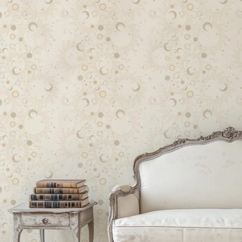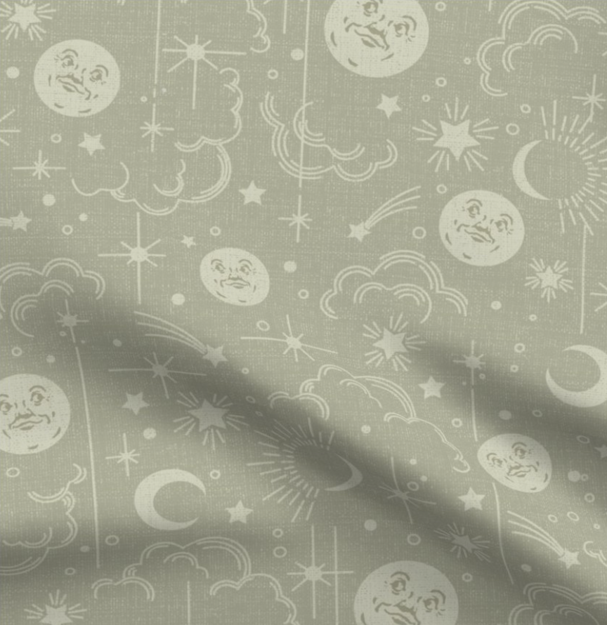 Sleepy suns and happy moons float atop clouds and stars with linen texture.