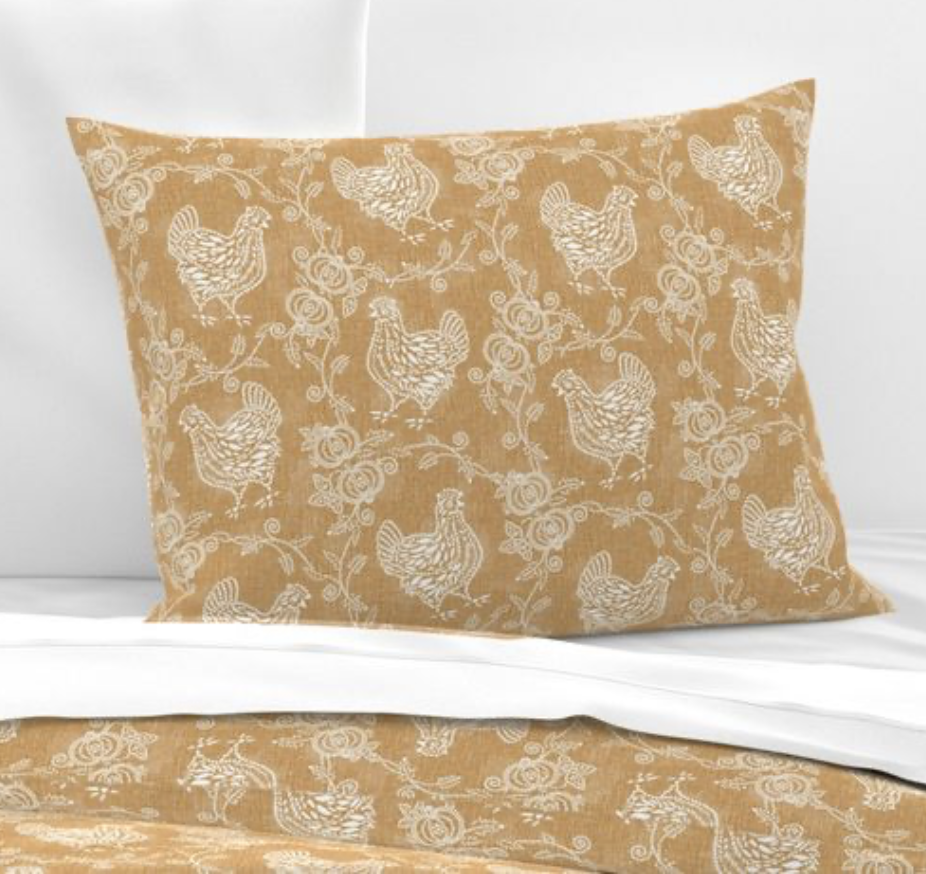 Farmhouse hens frolic among squash blossoms on a linen texture ground.